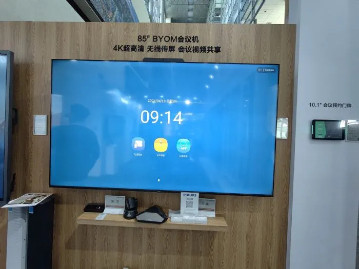 大尺寸显示设备普及化,家用产品大规模供给,这与多年前大尺寸显示面板更多倾向于高端商显特供的格局截然不同。以70英寸+产品为例,10年前国内市场的消费量仅有数万台(2014年3万台+),而75英寸现在已是国内彩电市场消费占比最高的细分尺寸线——国内市场大尺寸显示供给10年来成长了两三百倍。这种大屏显示供给的普遍化,与商务市场、会议应用中“书写”的非刚需、以及宏观经济不确定性导致的预算压力一起,构成了会议电视对会议交互平板市场的“持续蚕食”。